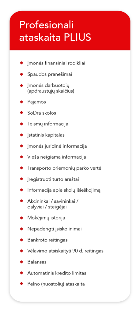 Jūsų verslo augimas priklauso nuo sėkmingų verslo ryšių. Įvertinkite partnerių bei klientų finansinę būklę su CREDITINFO ataskaitomis ir priimkite pasvertus sprendimus, suvaldydami galimas finansines rizikas.