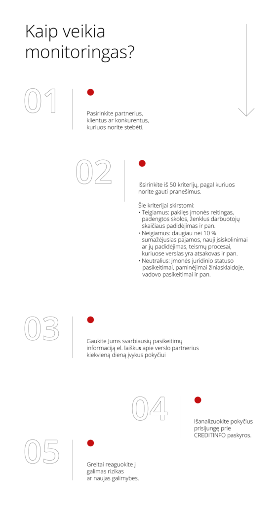 Monitoringas – sprendimas, skirtas operatyviai sužinoti apie pasirinktų partnerių ar klientų būklės pakitimus. Šiuos pokyčius galite matyti ir detaliau išanalizuot prisijungus prie KBS paskyros. Tai padės atpažinti nemokumo požymius bei atrasti naujas bendradarbiavimo galimybes: